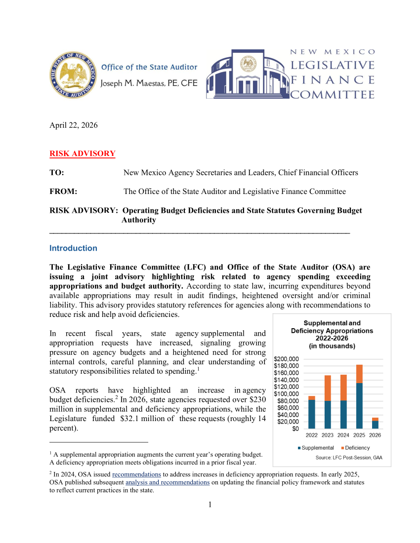 LFC and the Office of the State Auditor have issued a joint advisory to state agencies highlighting limits on spending.