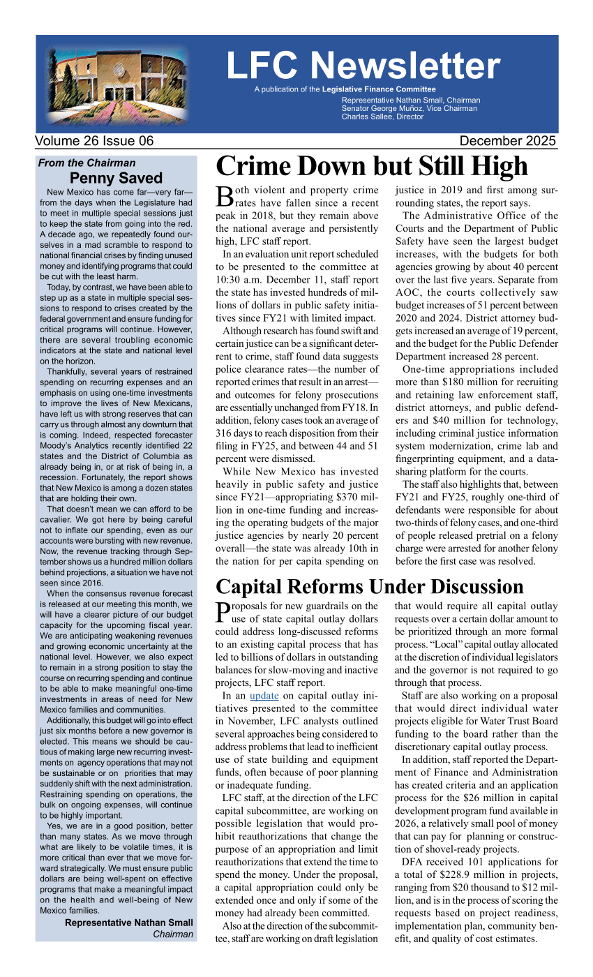 Session publications include the three volumes of the committee’s annual recommendation to the Legislature – policy and performance analysis, proposed appropriations, and supplemental tables and graphs – and the post-session review of legislative action.