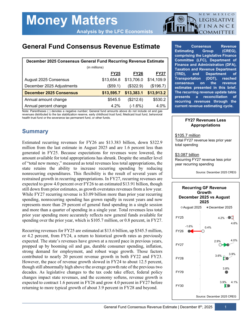 General Fund Consensus Revenue Estimate, December 2025