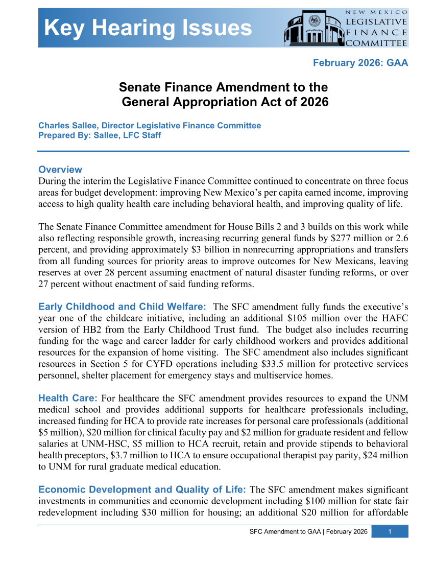 The House Appropriations and Finance Committee substitute for House Bills 2 and 3 would increase recurring spending by $294.5 million, or 2.7 percent, and has over $2.6 billion in nonrecurring spending projects and fund transfers.
